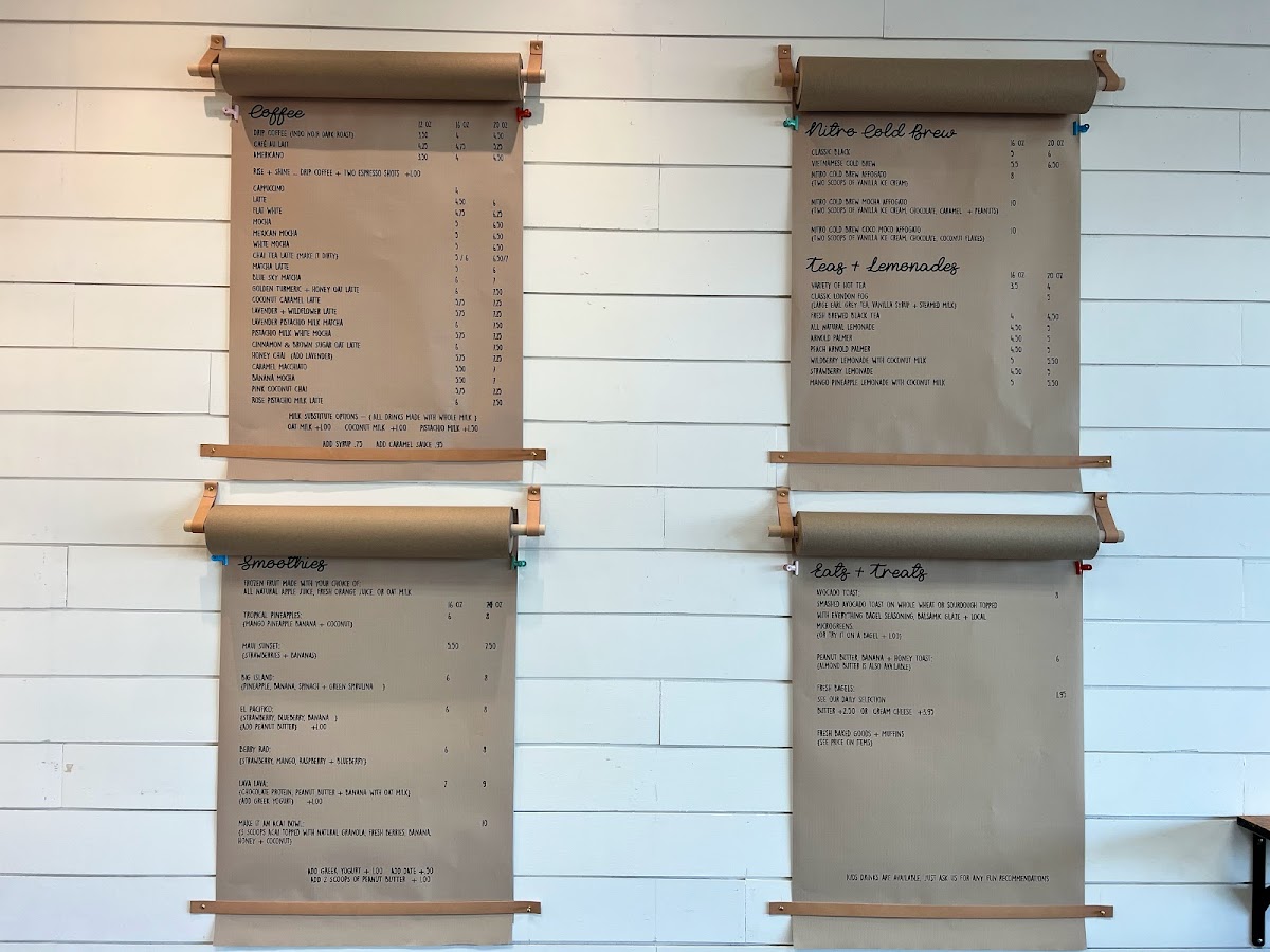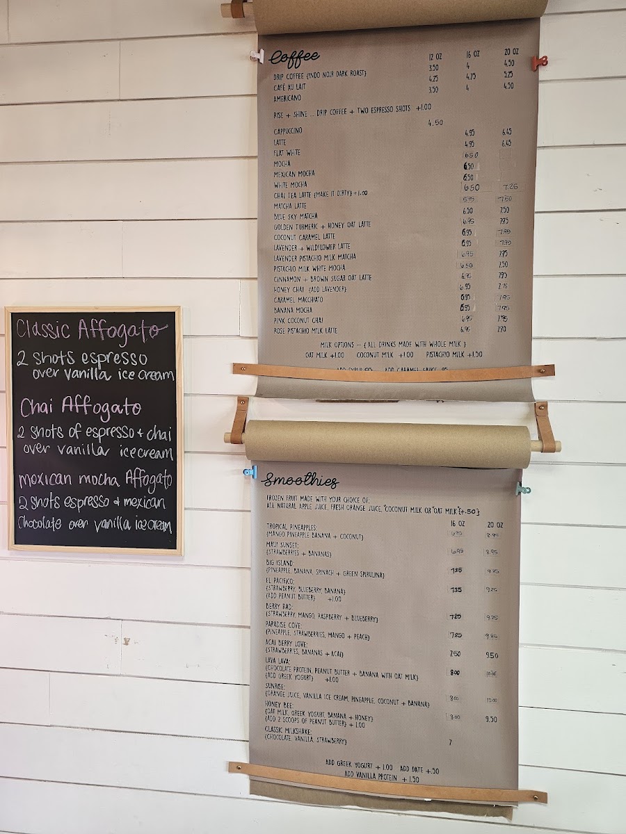 Moving on to the Smoothie Menu, you'll find vibrant options like the Maui Sunset and Acai Bowl that capture tropical bliss. The Coffee Menu is equally impressive, with fan favorites like the creamy Blue Sky Matcha and robust Americano.